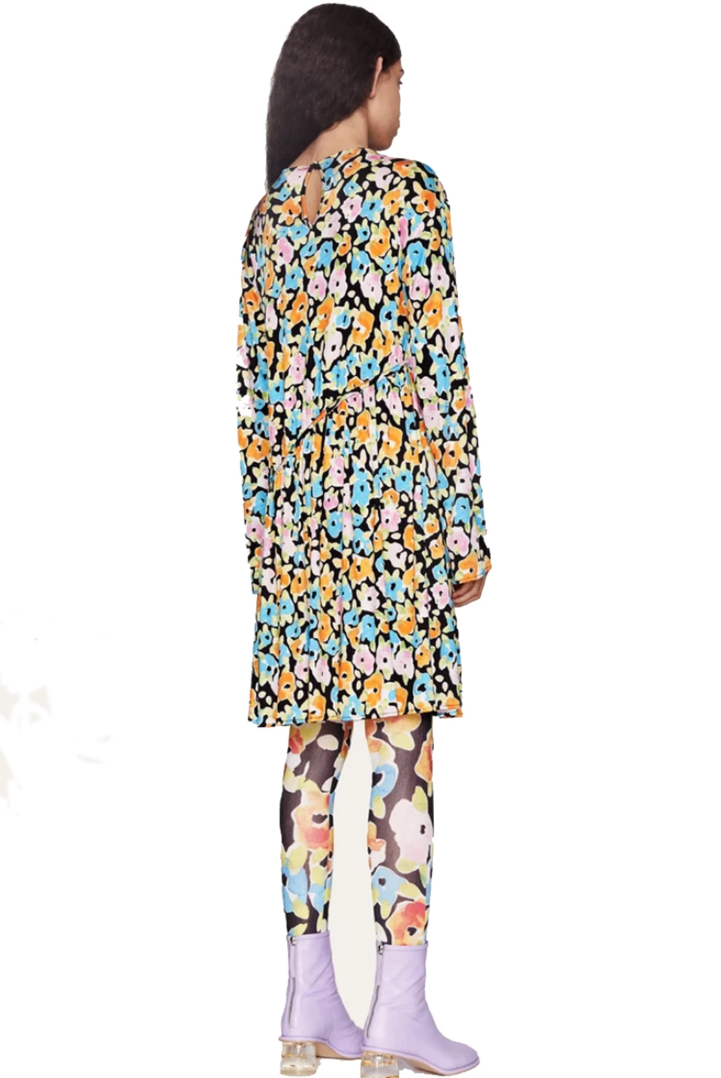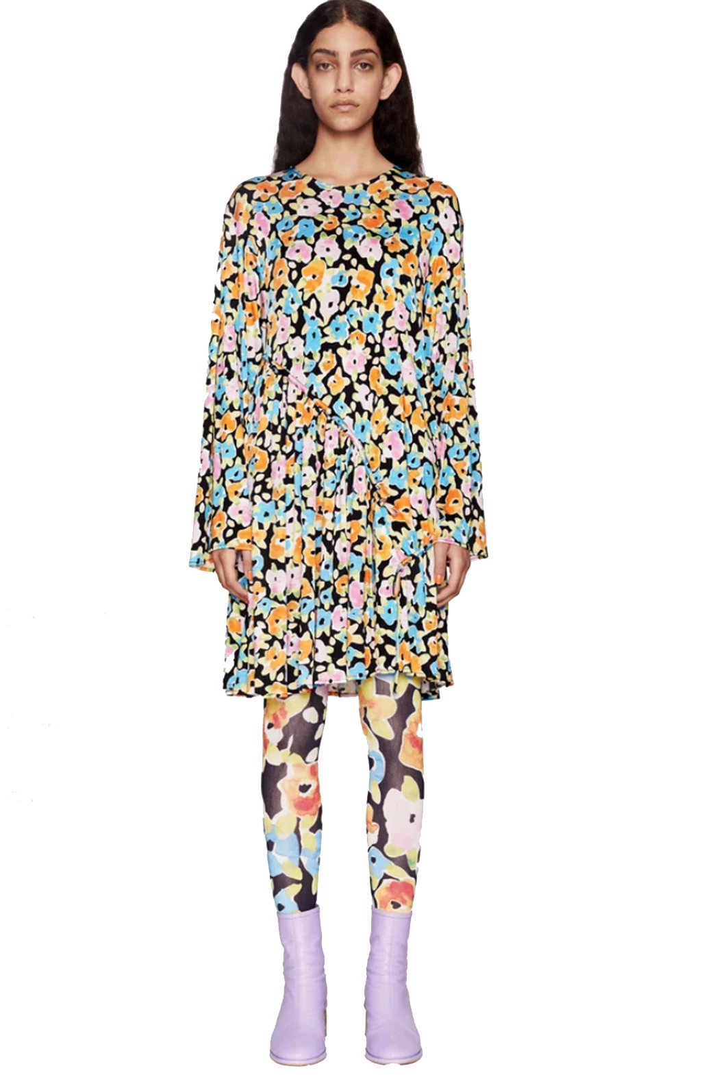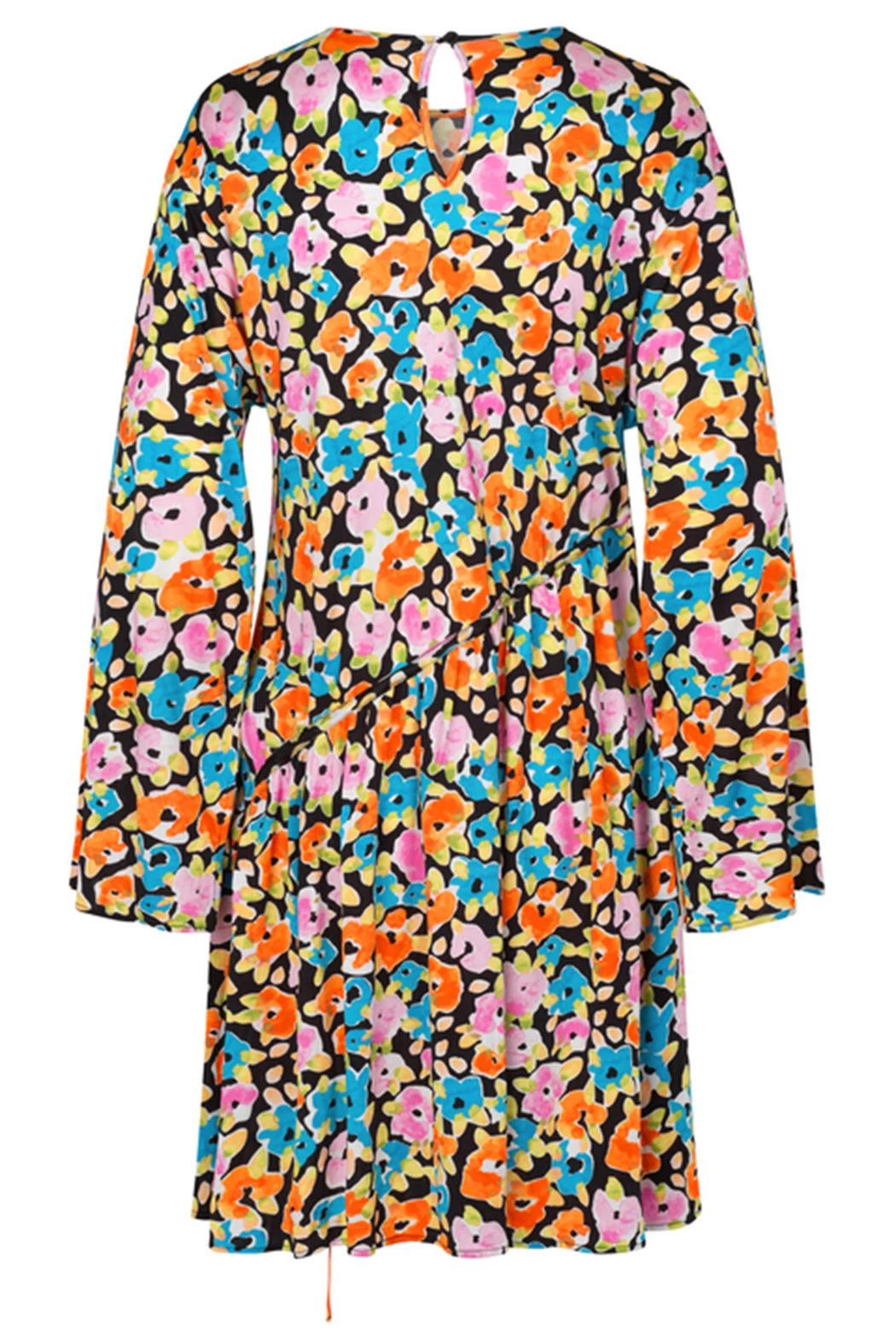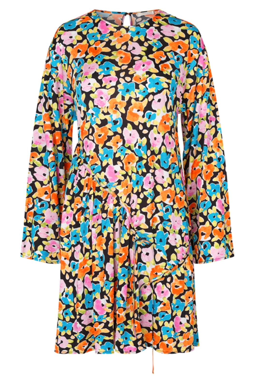 River Dress with Watercolour Flora print. Short dress made from a soft viscose jersey for a relaxed fit. Detailed with long sleeves, crew neck and self-ties at asymmetric ruched sides.