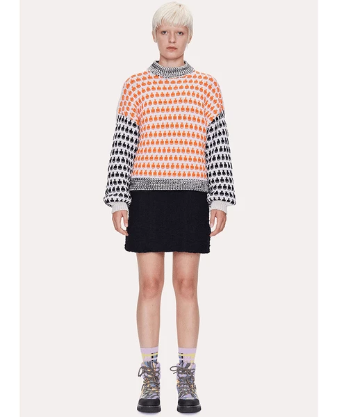 Stine Goya Scharla Lilac Sunset Knit, a orange and black knitted pullover jumper with a high round neck and long loose sleeves. Designed with off white ribbed cuffs and dropped shoulders the oversized Scharla jumper is crafted from an organic cotton blend. This is a green alternative to regular cotton, using less water and no toxic chemicals to produce. 41% Cotton 34% Polyamide & 25% Organic Cotton Hand wash cold and dry flat Model is 176cm and wears size XS – UK8 Measurements for size small: Chest 112 cm Bottom width 84 cm Sleeve length 50 cm Full length 56 cm XS – UK8, S – UK10, M – UK12, L – UK14 Stine Goya is very generously sized so we would recommend sizing down.