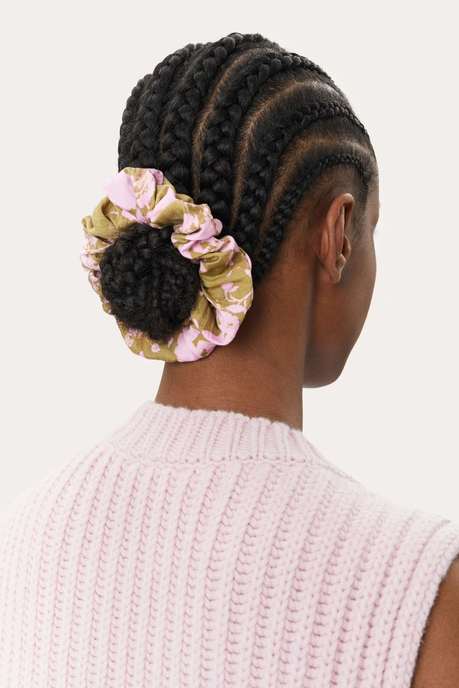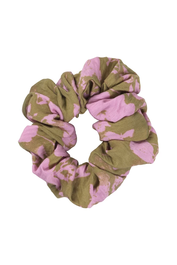Scrunchy in Flower Foliage Pink print. Classic scrunchie made of light weight material with floral pattern. Made of LENZING™ Modal blend.