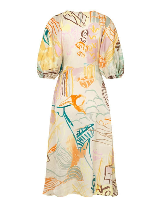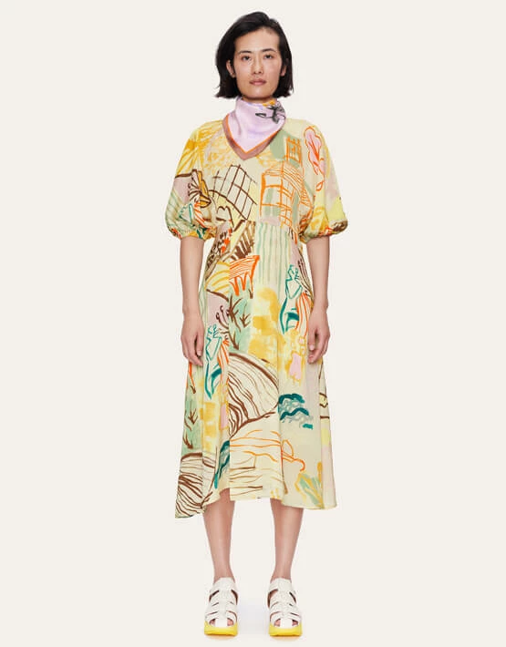 – Midi Dress – Round neck – Short voluminous sleeves – A-line – High, slim fit waist – Concealed side zipper – Painterly ‘Charleston House’ print – Lilac, Orange, Blue and Yellow – 54% LENZING™ Lyocell, 46% Viscose – STINE GOYA RD Size: S