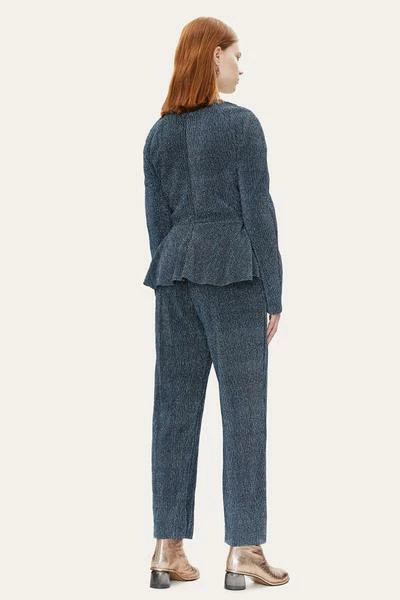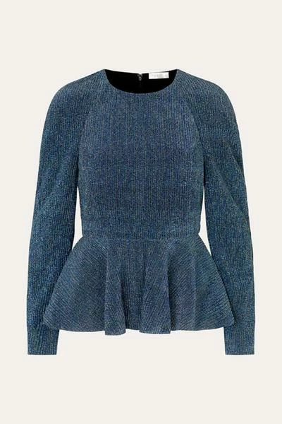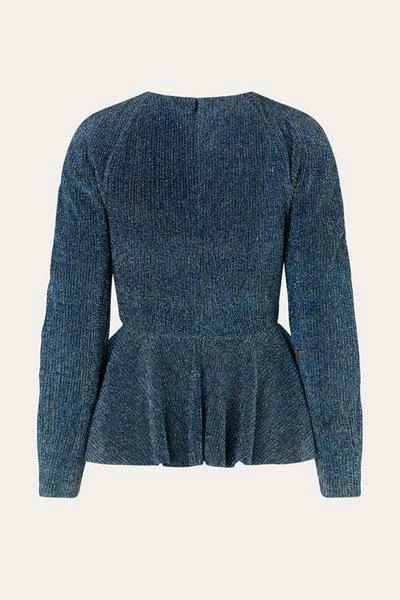 Tyra Blouse in Glitter Rainbow. Peplum blouse with loose tapered sleeves. Ribbed metallic fabric with zip fastening. Fully lined. Measurements for size small: Chest 90 cm Waist 77 cm Bottom width 204 cm Sleeve length (raglan) 74 cm Full length 61 cm 50% polyester/50% metallic Machine wash