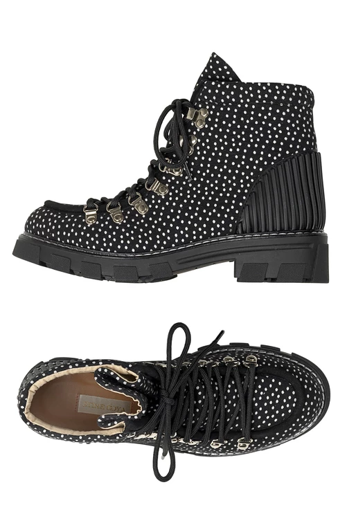 Vera Boots in White Dot. Durable structured lace-up ankle boots with subtle all over polka-dot pattern. Tough rubber sole and heel support.